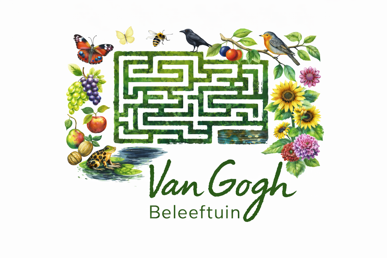 De Van Gogh beleeftuin bestaat uit een vlindertuin, fruitlaan, paardenweide, paddenpoel, bosje, bloemstroken én een doolhof op basis van levende wilgentakken.