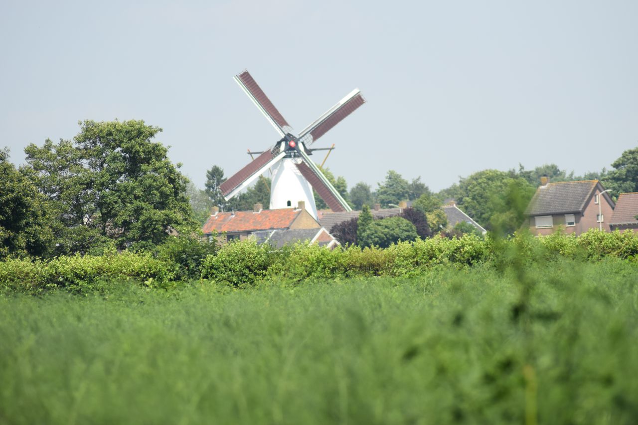 Net buiten de dorpskern aan de Halsterseweg torent een witte ronde stenen bergkorenmolen boven de bebouwing uit.