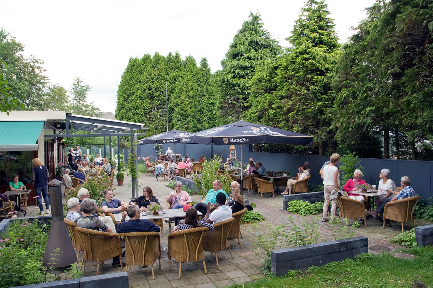 Je kunt een plekje zoeken in het café, maar ook op het ruime terras. De kinderen kunnen zich prima vermaken op de speels aangelegde speelweide.