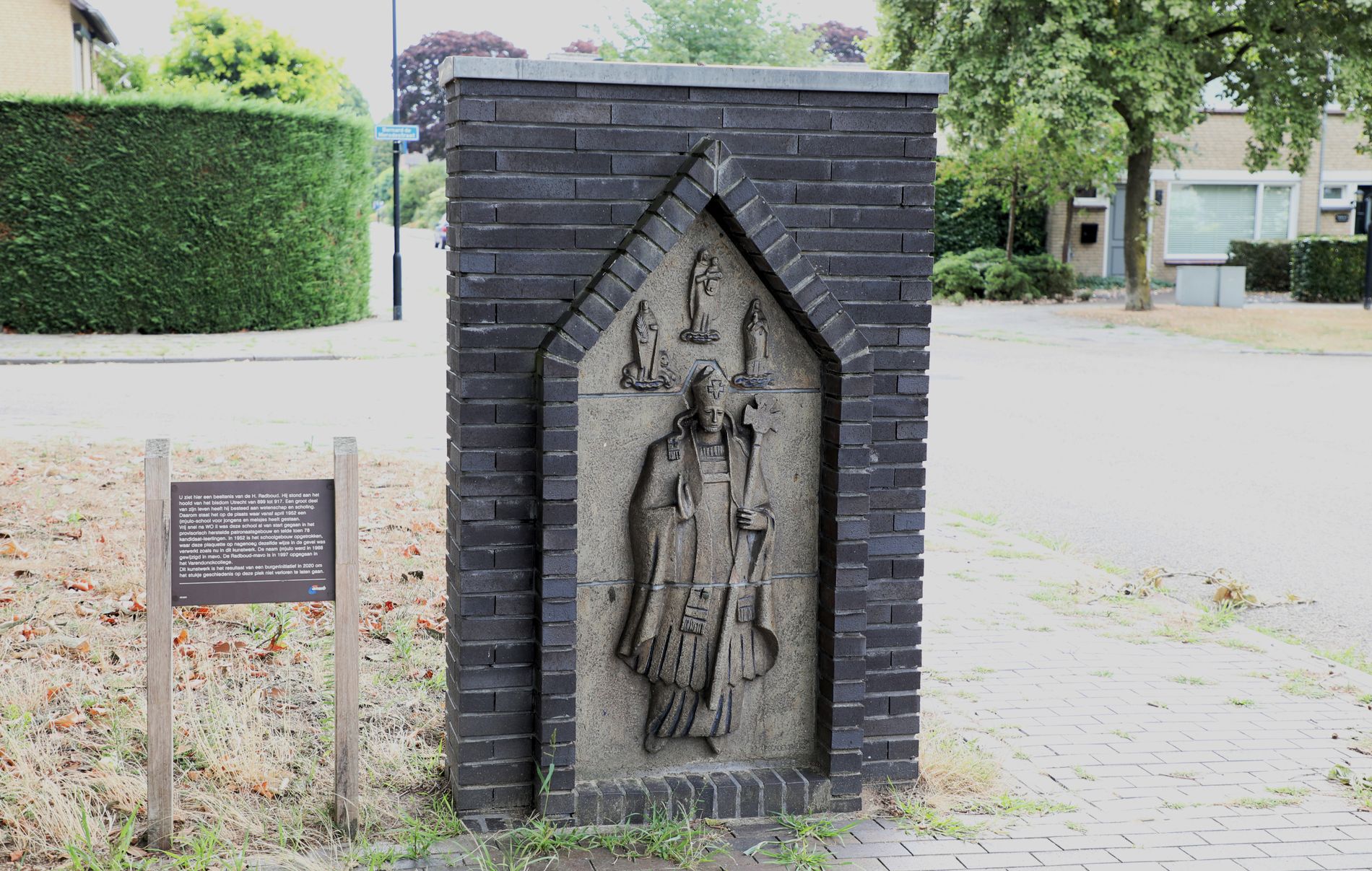 Je ziet hier de beeltenis van bisschop Radboud geflankeerd door de heiligen Maria met kind, Lucia met palmtak en Agnes met lam. Radboud was bisschop van het bisdom Utrecht van 899 tot 917. Een groot deel van zijn leven heeft hij besteed aan wetenschap en scholing. Dit kunstwerk staat hier op de plaats waar vanaf april 1952 een (M)Uloschool voor jongens en meisjes heeft gestaan. Vrij snel na de Tweede Wereldoorlog, in oktober 1945, was deze school al van start gegaan in het provisorisch herstelde patronaatsgebouw en telde toen 78 kandidaat-leerlingen. Later is in 1952 het schoolgebouw opgetrokken waar deze plaquette op ongeveer dezelfde manier in de gevel was verwerkt zoals nu in dit kunstwerk. De naam (M)ULO werd in 1968 gewijzigd in MAVO.