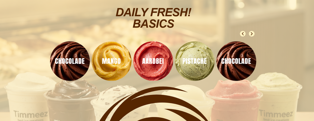 Dagelijks worden er bij timmeez minimaal 16 soorten ijs vers bereidt. Uiteraard gebruiken we enkel de allerbeste grondstoffen zoals 100% Italiaanse pistache en hazelnoot en de beste pure chocolade.