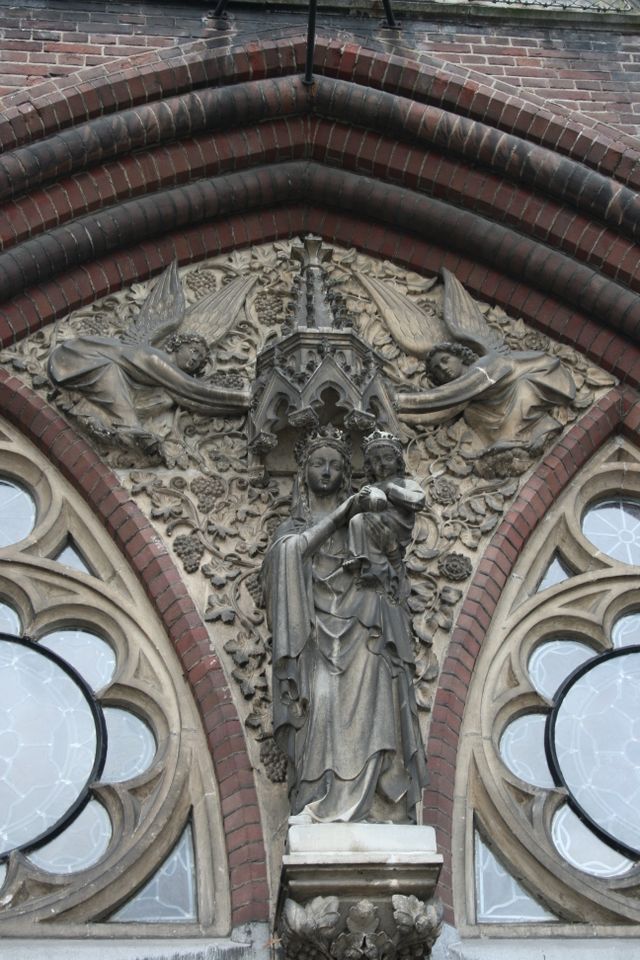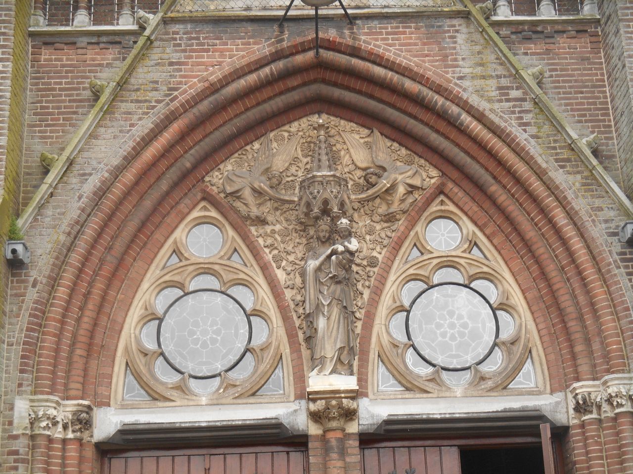 Het beeld daarboven de presentatie van de 7-jarige Maria. Waaraan deze kerk zijn naam te danken. Het beeld is in 1898 gemaakt door Atelier Thissen te Roermond.